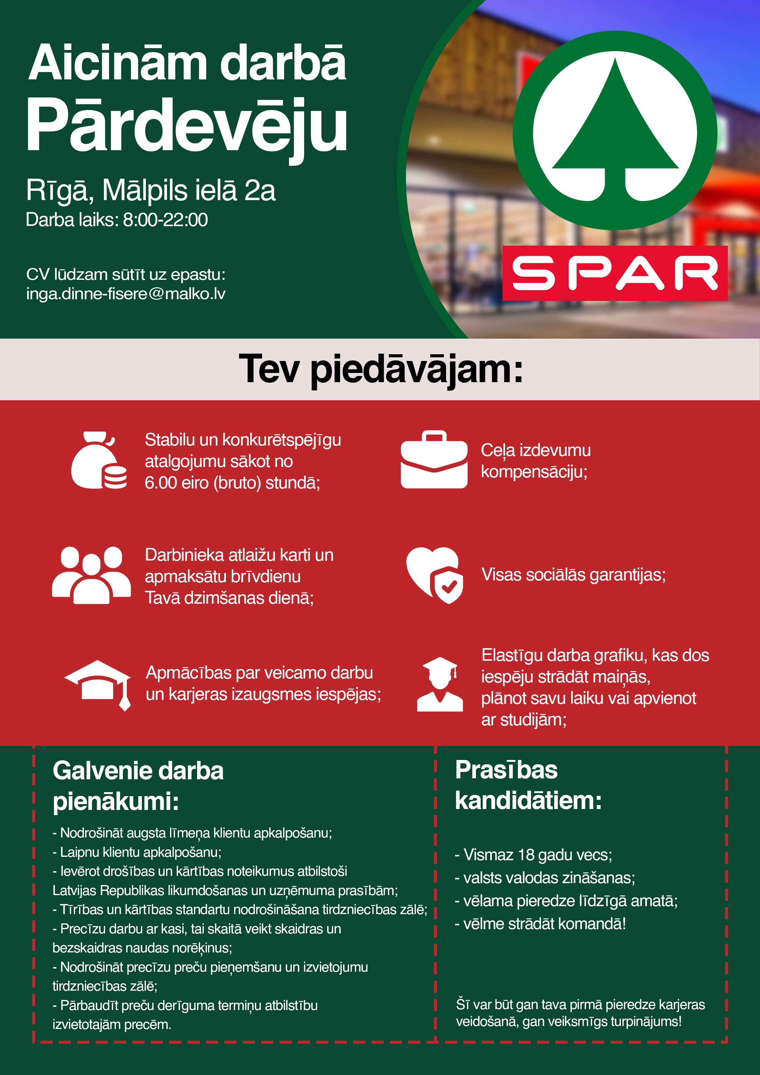 Pārdevējs/-a SPAR veikalā, Mālpils ielā 2a, Rīgā